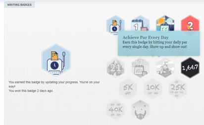 While I am hoping to get to 50,000 words at the end of the month, I have a different goal pushing me forward this month. Through the NaNoWriMo website, I am tracking my word count. My goal is to update my word count every day and stay “on track” with my word count (meaning I will have to write 1,667 words each day). I’d love to say there is a special prize for doing this, but my true motivation is to receive to special digital badges for reaching both of these goals!