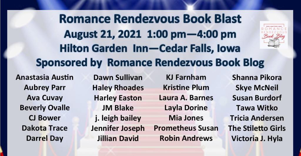 I’m so excited to be getting ready for the Romance Rendezvous Book Blast (RRBB) in August. I have attended many years as a reader and I’m overjoyed to now be one of the attending authors! This event will be taking place in Cedar Falls, Iowa and is FREE TO ATTEND! There will be many romance authors (of a variety of sub-genres) with fun games, raffles, and swag. It’s a great way to find new authors to follow and new books to read.