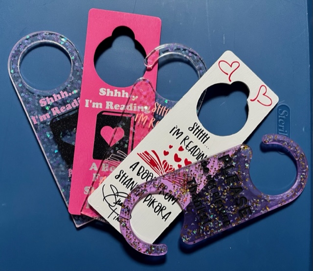 I’m always a big fan of these when I get them as swag, so I was really excited. I started with the wooden ones — and quickly learned I should not be trusted with spray paint (there is pink an white all over our garage now). So, we tried out the resin ones. They are SUPER cool looking, but they take so much resin — so we will be getting door hangs printed in the future – sorry! But, I will have these ones until they run out, so be sure to stop by my next event, Romance Rendezvous (Cedar Falls, IA) if you want one!